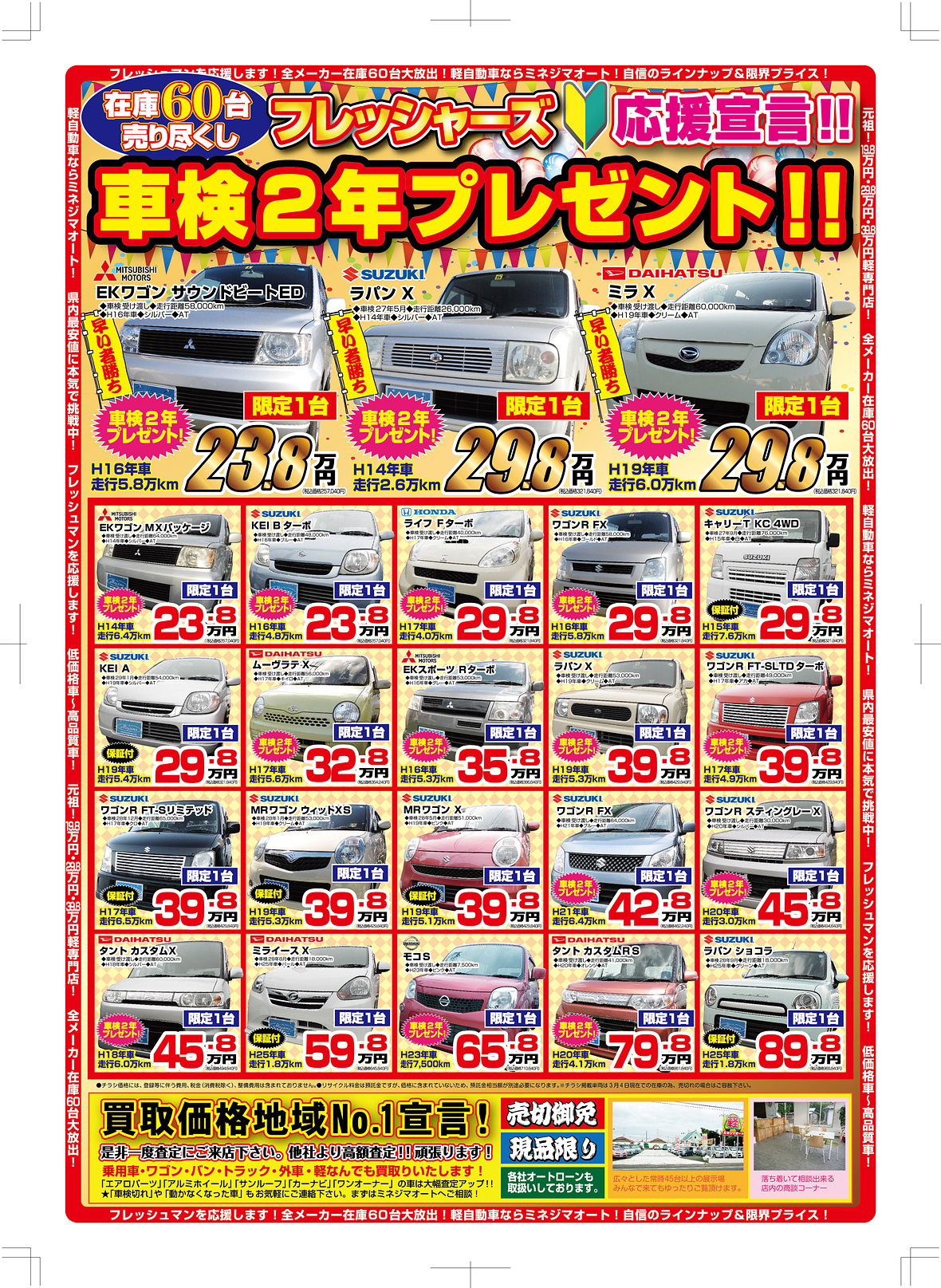 3/7(土)8(日)9(月)10(火)11(水)即決ご成約の方車検2年プレゼント!!なんと車検費用が無料です!!※車検なしの車にかぎります。※再来店の方は対象外です。