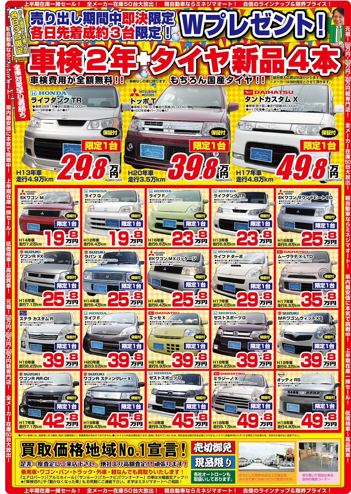 6/19(金)20(土)21(日)22(月)!4日間限定!!!セール期間中の先着ご成約各日3台限定車検2年+国産タイヤ新品4本(即決ご成約の方限定Wプレゼント)AM10時オープンです!!早いもの勝ち!!!
