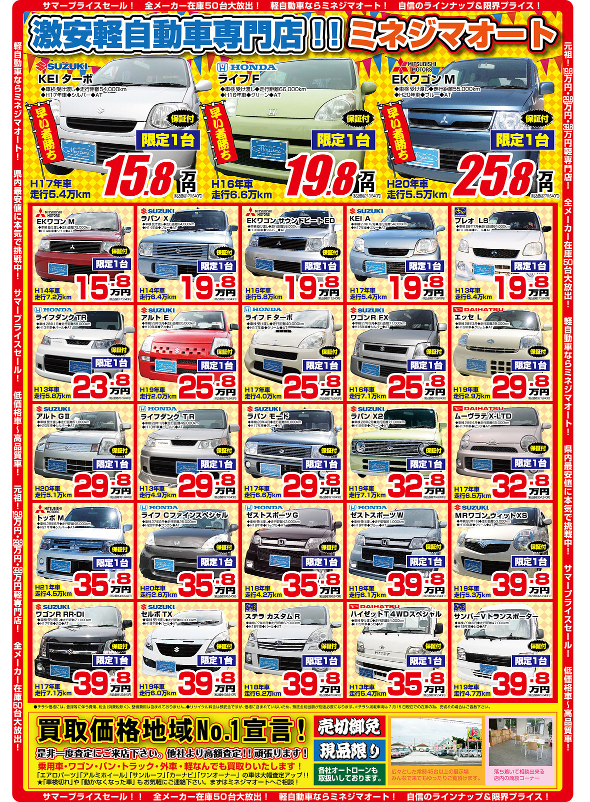 自信のラインナップ&限界プライス!整備も安心!車検も安心!認証工場完備!!今回、限界最安値に挑戦!9.8万円~激安軽自動車勢揃い!7月18(土)19(日)20(月)21(火)22(水)5日間限定!!!国産タイヤ新品4本プレゼント(メーカーは当社指定とさせて頂きます。※組み換え工賃は別途かかります。)全車対象、即決ご成約の方※再来店の方は対象外です。