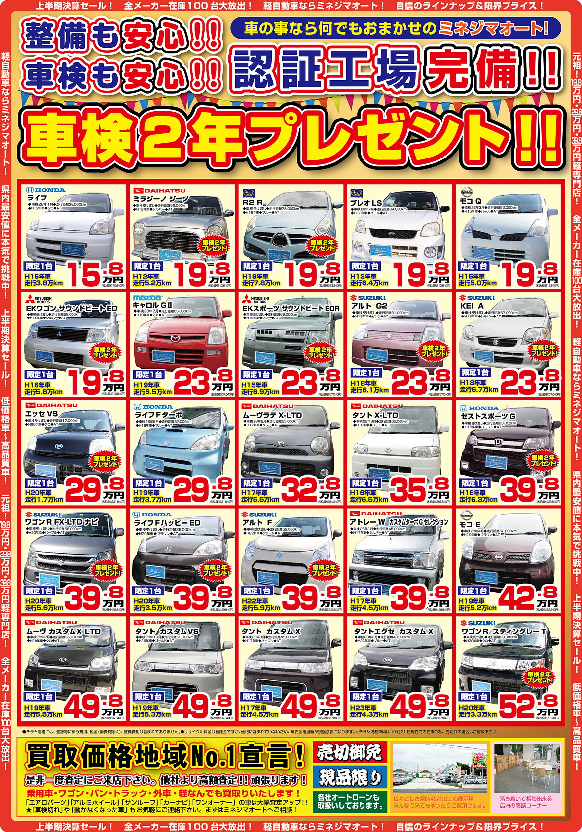 10/24(土)25(日)26(月)27(火)28(水)AM10:00オープン総在庫数100台! 上半期大決算セール!即決ご成約の方に車検2年プレゼント‼車検費用がなんと0円‼
