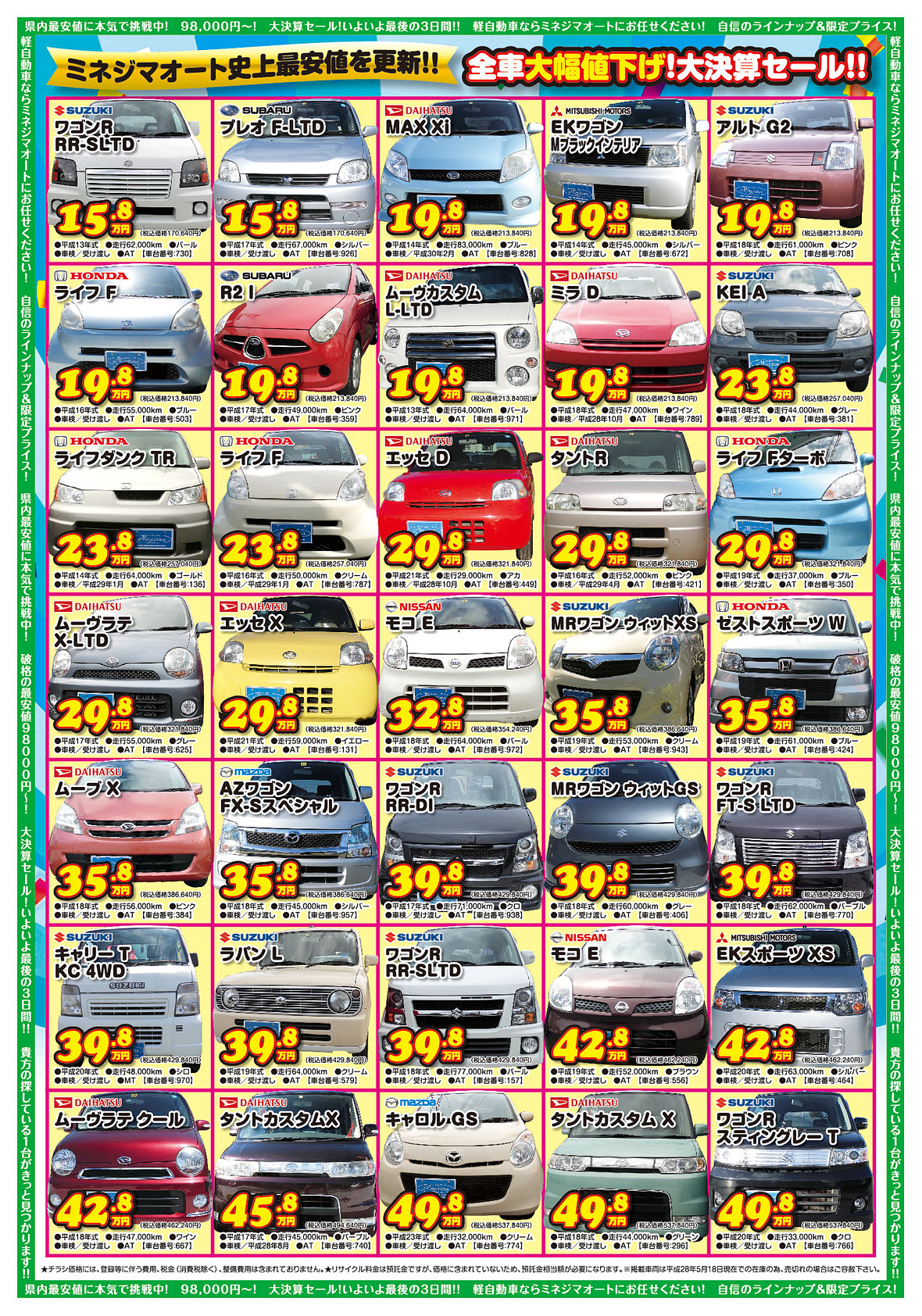 ホンダ ライフ が9.8万円!! スズキ アルト が19.8万円!! ダイハツ タント が29.8万円!! ダイハツ ムーヴ が39.8万円!!