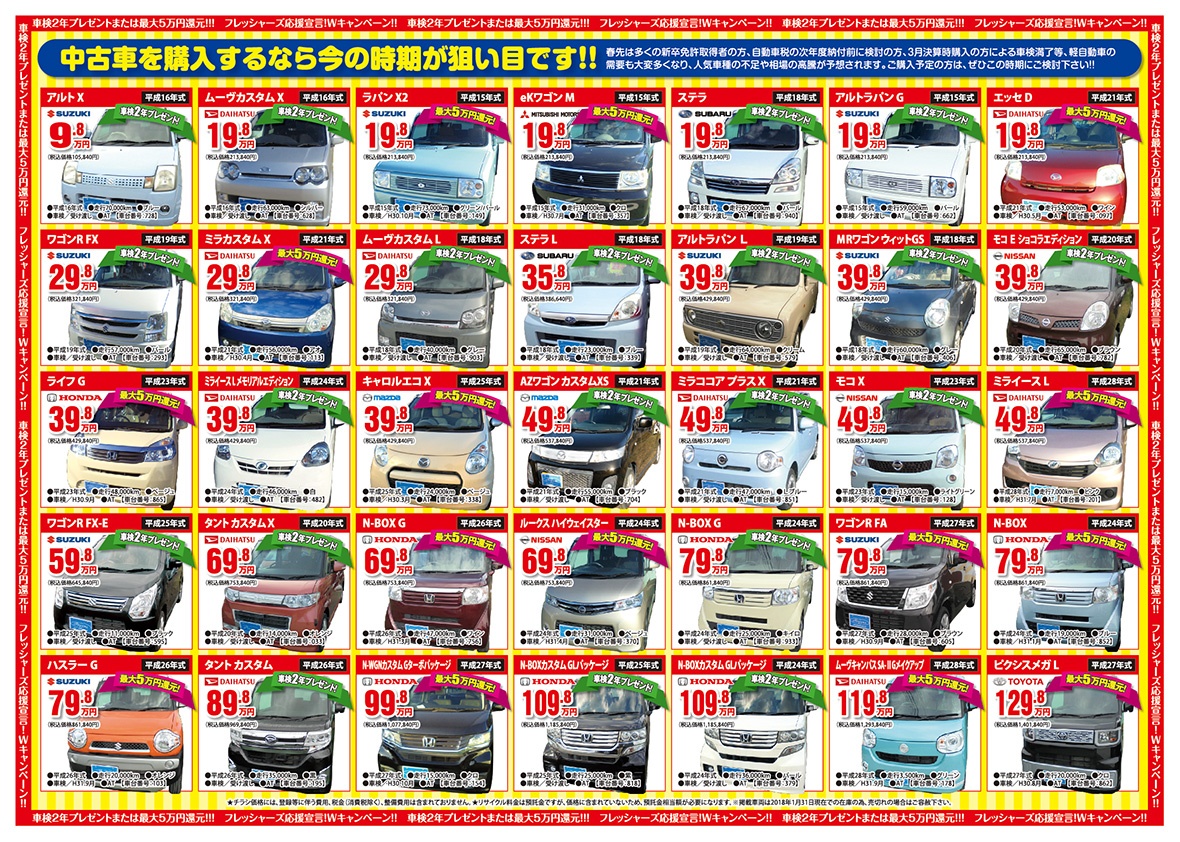 2018 2/3(土)・4(日)・5(月)・6(火)・7(水)5日間朝10時オープン!!地域最大級!総在庫数150台以上 大放出!!今年もやりますWキャンペーン!1、車検の無いお車車検2年プレゼント!(※車検法定費用が0円!!!)2、車検の有るお車最大5万円還元!頭金不要『ミネジマオートらくらくお支払いローン』★パートアルバイトの方もO.K★年金でお暮しの方もO.K最長96回払い可能!(※事前審査がございます。)