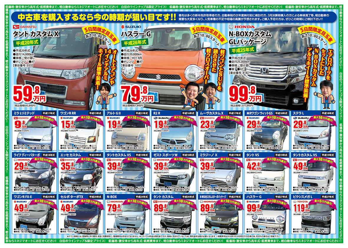 2018 2/17(土)・18(日)・19(月)・20(火)・21(水)の5日間朝10時オープン!!とことんやります!今だけ最大10万円超大還元!!今春、就職される方・進学される方も必見!今月のミネジマオートは超お買得です。※この機会をぜひお見逃しなく!!!