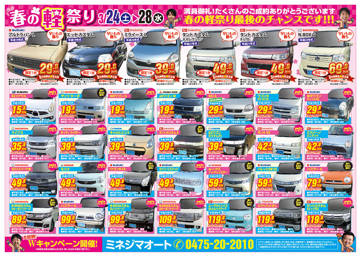 満員御礼!たくさんのご成約ありがとうございます2018 3/24(土)・25(日)・26(月)・27(火)・28(水)5日間朝10時オープン!!就職・進学される方必見!春の軽祭り最後のチャンス!!!