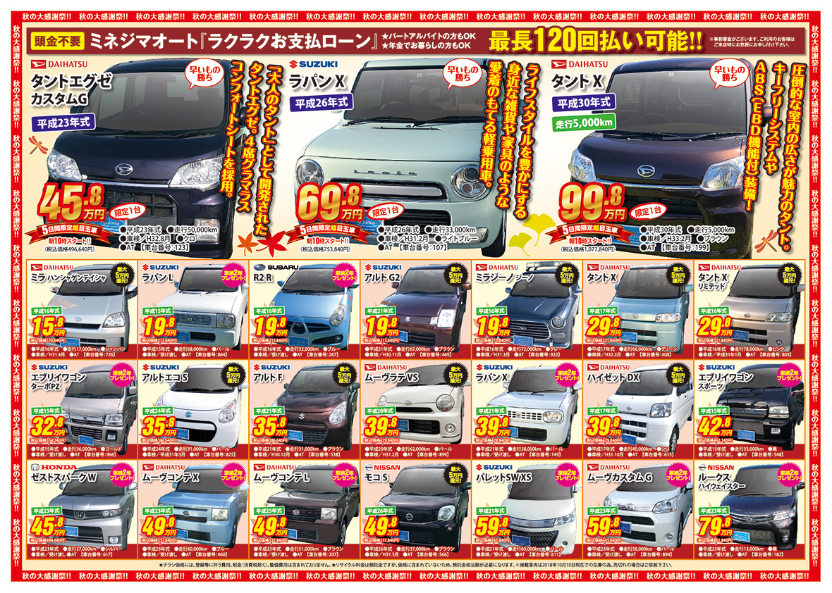 2018 10/13(土)・14(日)・15(月)・16(火)・17(水)5日間朝10時オープン!!誰もが驚く衝撃価格!!大好評Wキャンペーン!①車検の無いお車・・・車検2年プレゼント!※車検法定費用が0円※②車検のあるお車・・・最大5万円還元!皆様のご来店を心よりお待ちしております!